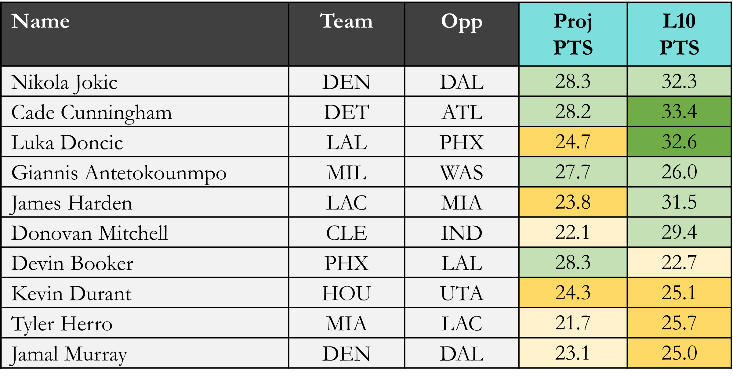 Top players in points scored according to Rotowire & NBA.com, which is available in the table(s) below. Overall rank is based on daily projections, last 10 average, and season averages, which is stack ranked amongst peers for each objective. When there is a single objective, the three data points are still used to stack rank the players vs. ranking solely on projections. For tome+ members, all active player stats are available in the provided data file. Omission of certain players would be based on injuries at the time of data pull.