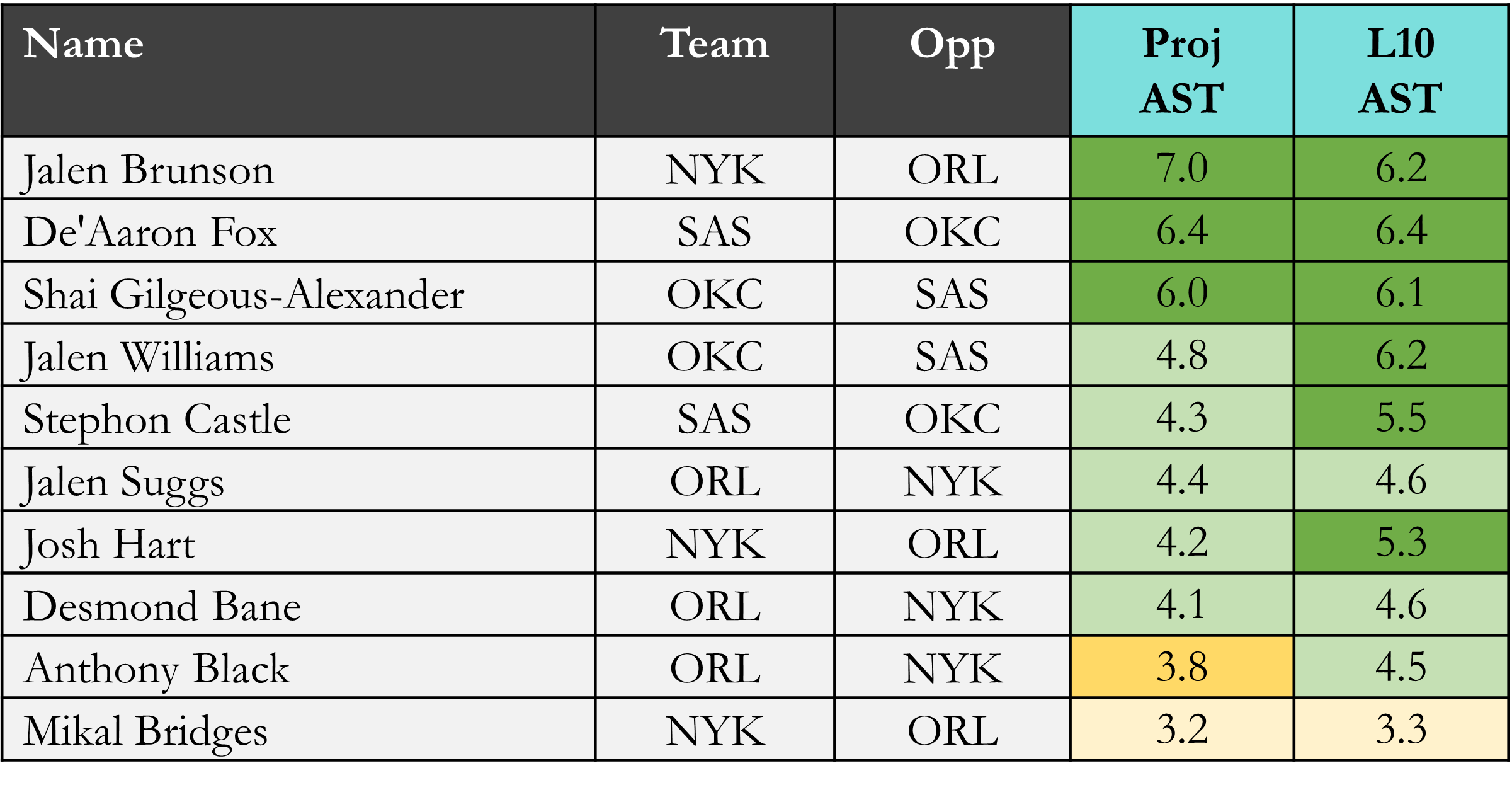 Top players in assists according to Rotowire & NBA.com, which is available in the table(s) below. Overall rank is based on daily projections, last 10 average, and season averages, which is stack ranked amongst peers for each objective. When there is a single objective, the three data points are still used to stack rank the players vs. ranking solely on projections. For tome+ members, all active player stats are available in the provided data file. Omission of certain players would be based on injuries at the time of data pull.
