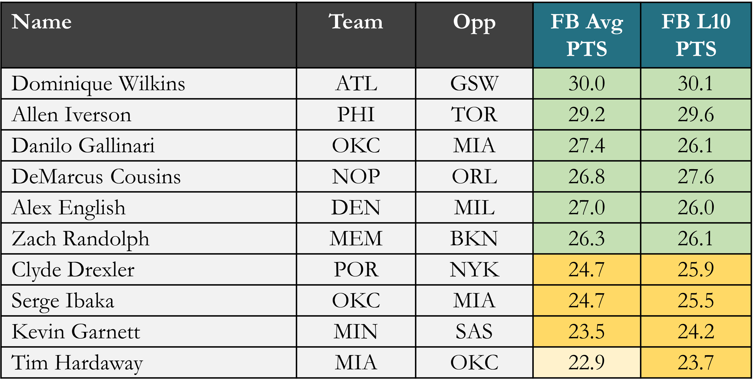A Tier (averaged 26.0+ PTS): Allen Iverson, Danilo Gallinari, DeMarcus Cousins, Alex English, Zach Randolph