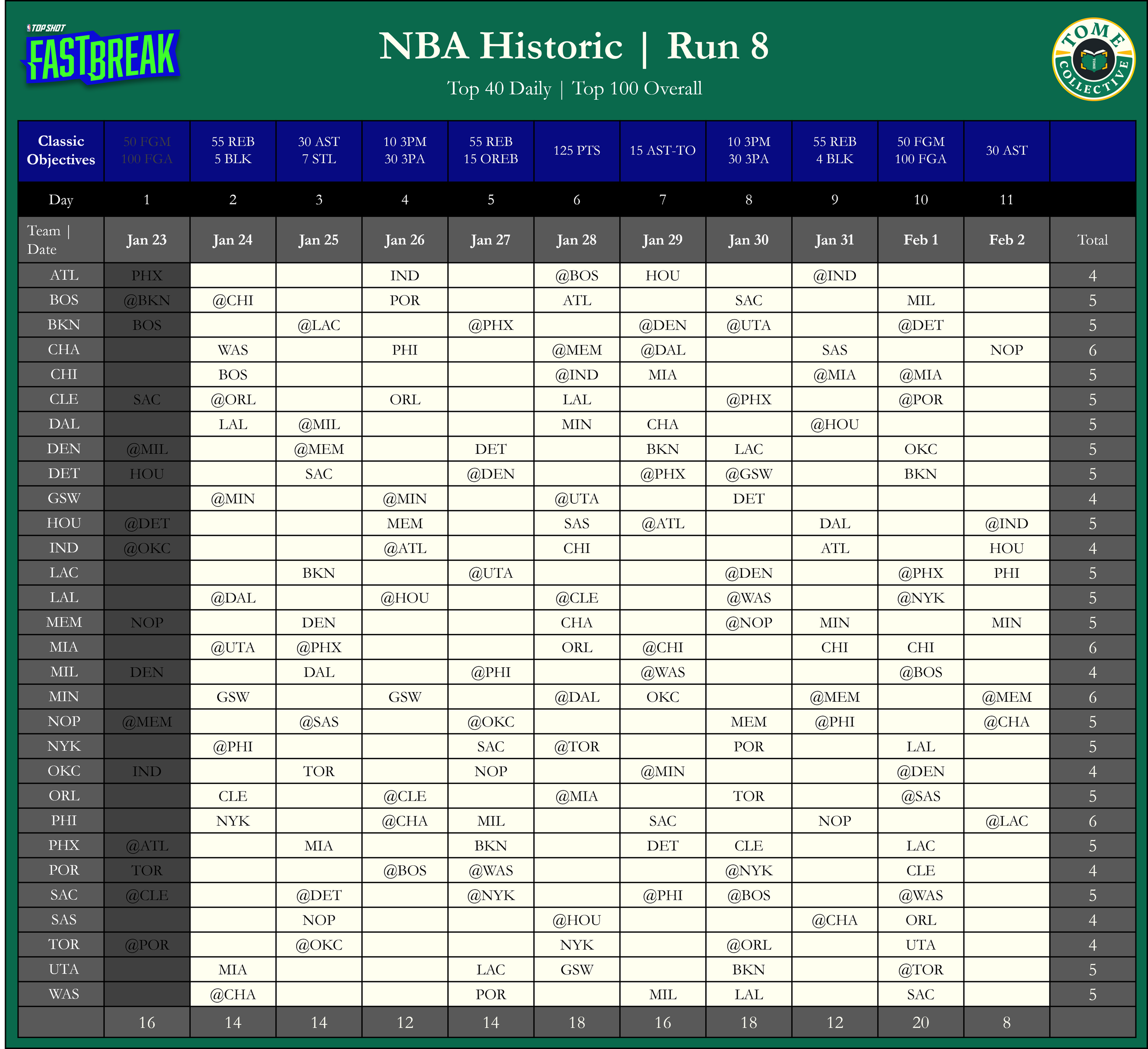 Objective(s): 55 Rebounds & 5 Blocks (11.0 REB & 1.0 BLK)
