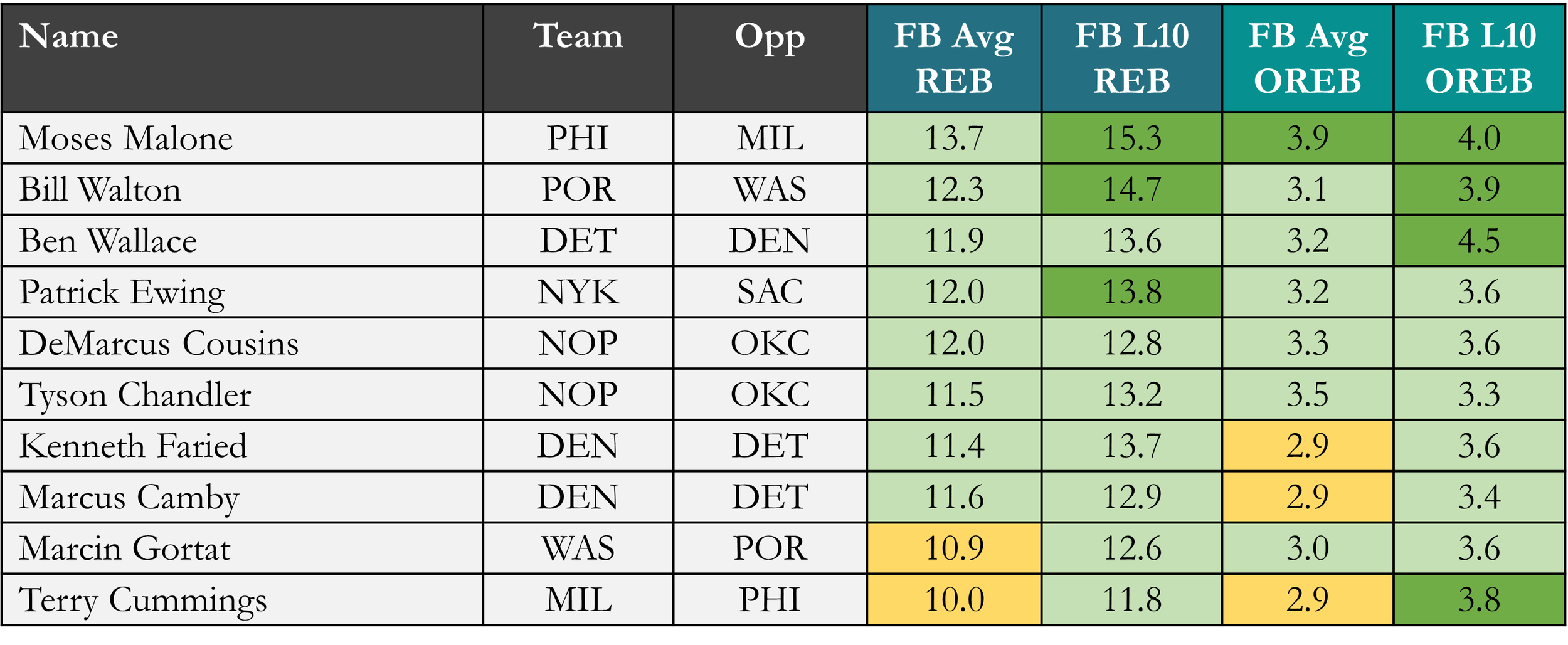 A Tier (averaged 11.0+ REB & 3.0 OREB): Bill Walton, Patrick Ewing, Kenneth Faried, Ben Wallace, Tyson Chandler, Marcus Camby, DeMarcus Cousins, Marcin Gortat, Vlade Divac, Terry Cummings, Carlos Boozer