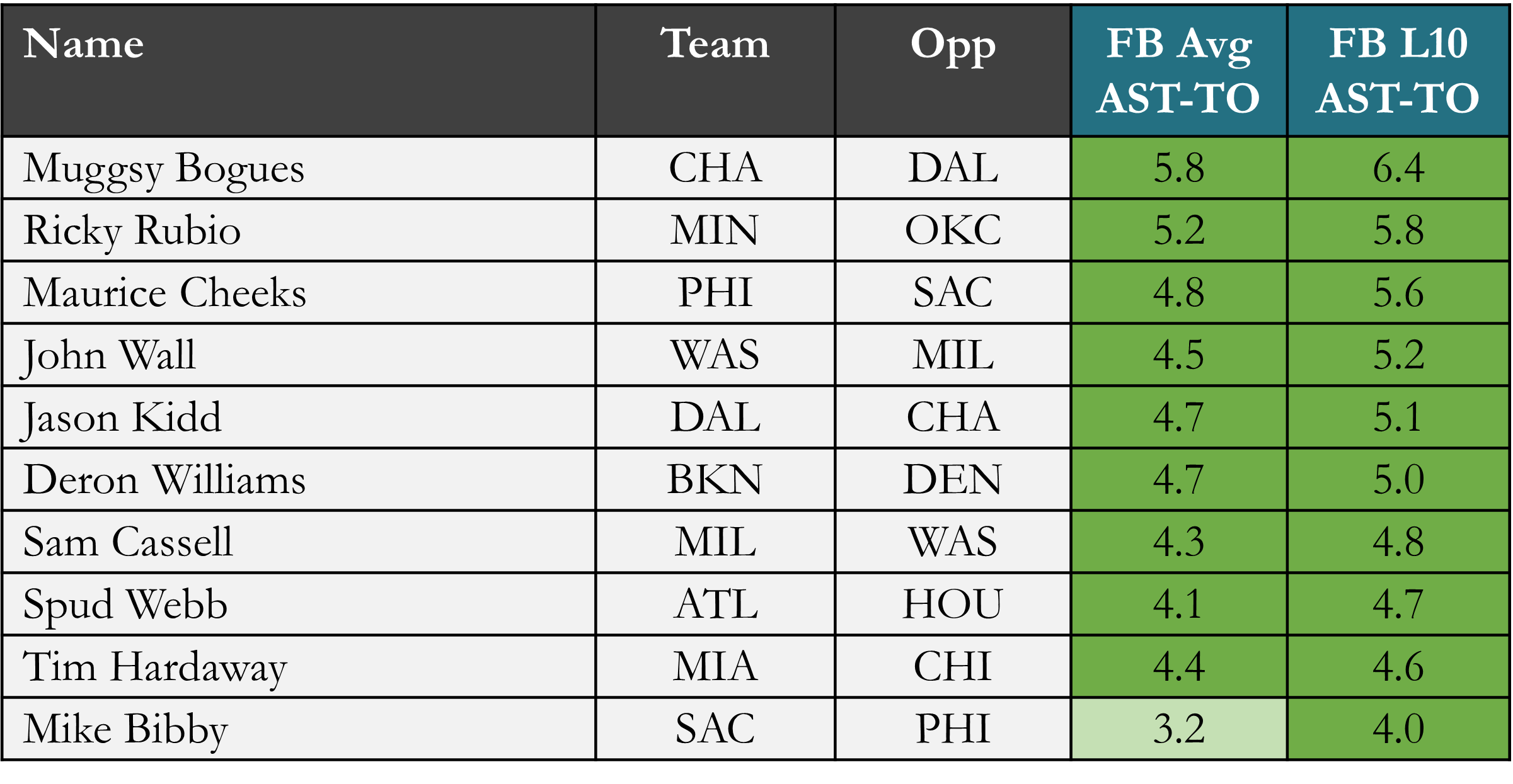 Top players in assists minus turnovers according to Rotowire & nbatopshot.com, which is available in the table(s) below. Overall rank is based on average results (across multiple historic runs), which is stack ranked amongst peers for each objective. When there is a single objective, the data points are still used to stack rank the players. For tome+ members, all active player stats are available in the provided data file.