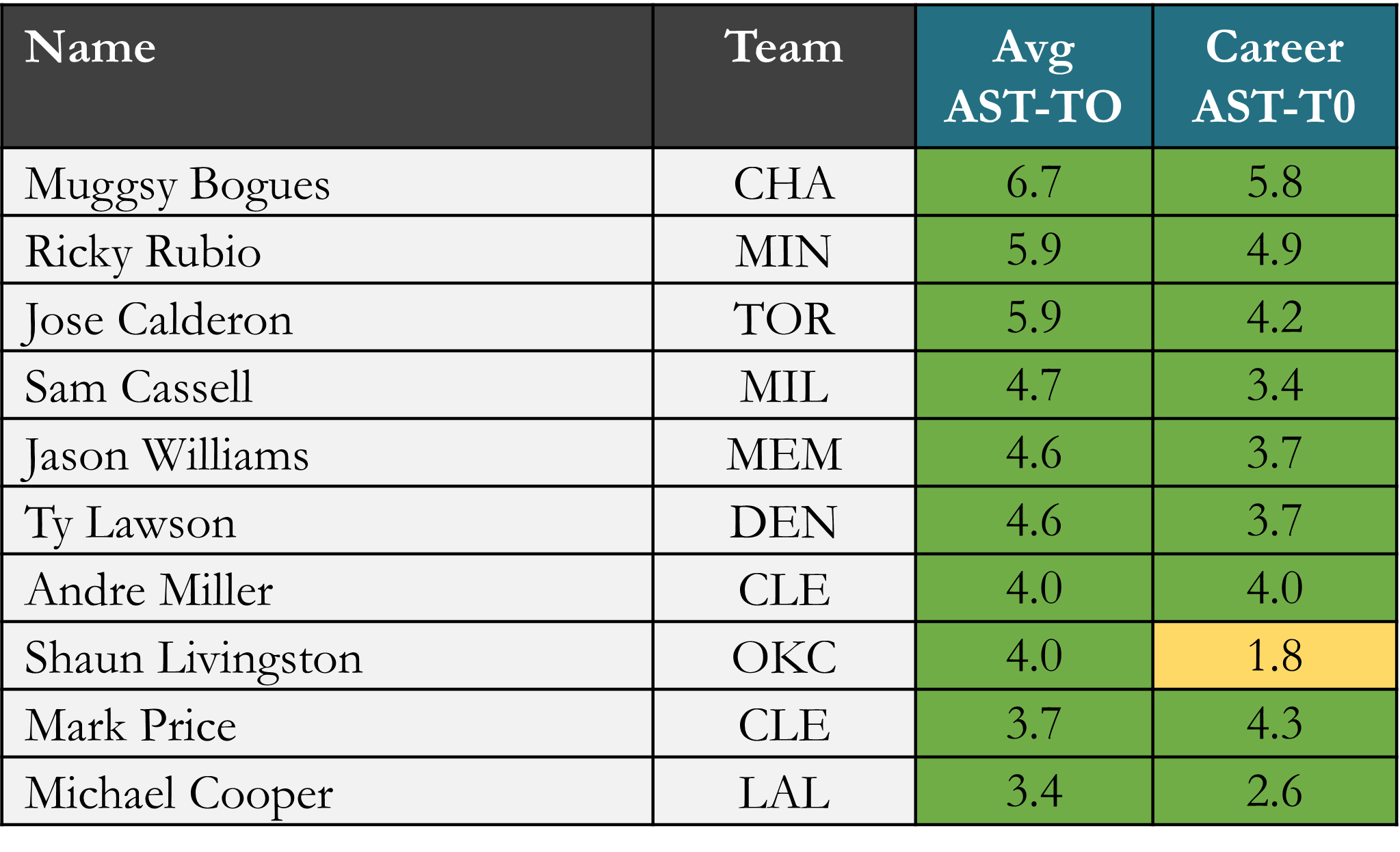 A Tier (averaged 2.0+ AST-TO): Sam Cassell, Jason Williams, Ty Lawson, Andre Miller, Shaun Livingston, Mark Price, Michael Cooper, Jalen Rose, Kemba Walker, Mahmoud Abdul-Rauf, Derek Fisher, Brad Daugherty