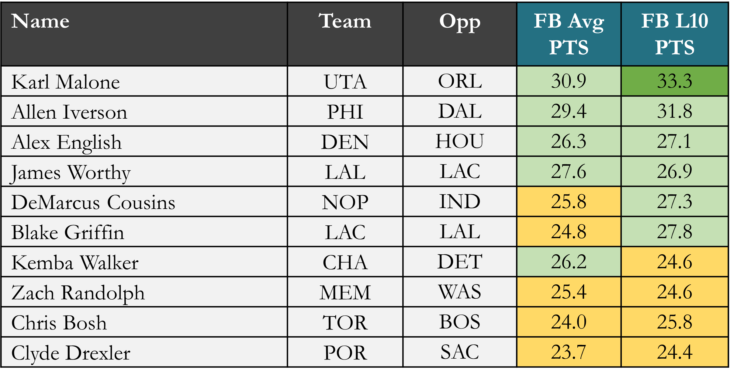 A Tier (averaged 26.0+ PTS): Alex English, James Worthy, DeMarcus Cousins, Blake Griffin