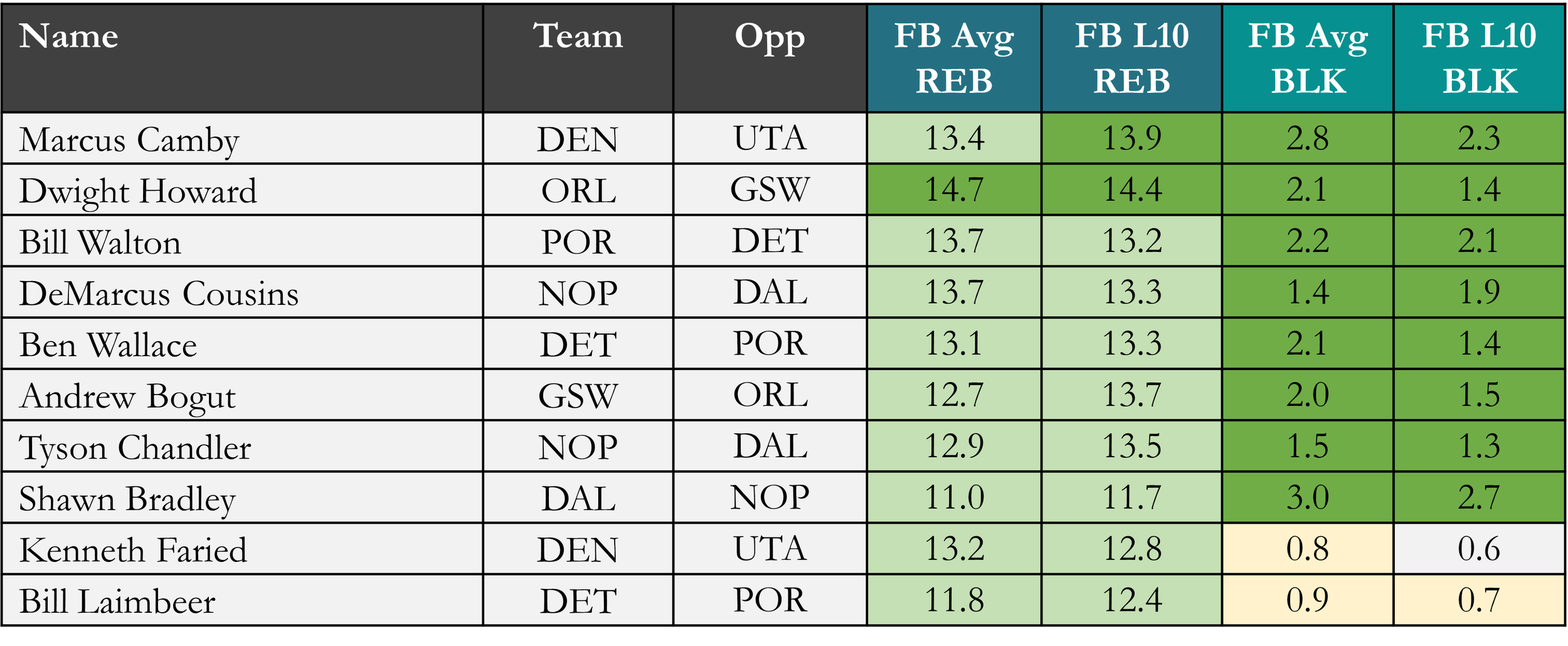 A Tier (averaged 11.0+ REB & 1.0+ BLK): DeMarcus Cousins, Ben Wallace, Andrew Bogut, Tyson Chandler, Shawn Bradley