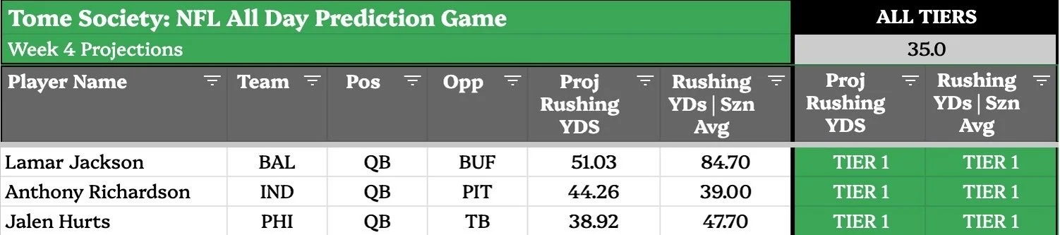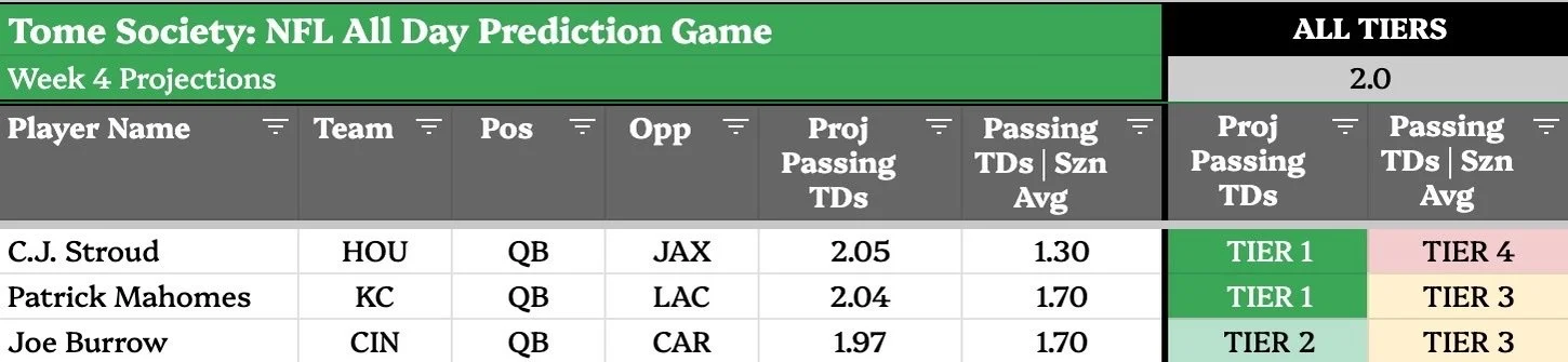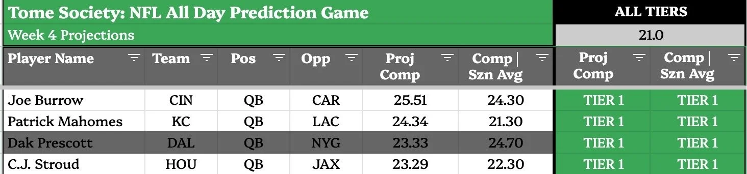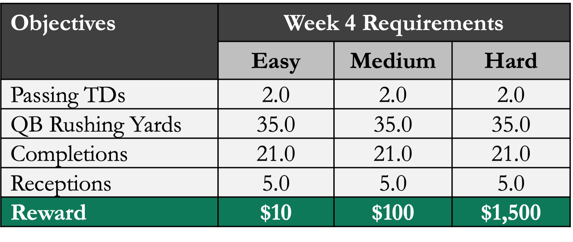 Selecting all four (4) players correctly based on the target objectives will earn you the rewards within each tier. After the first two iterations of this prediction game, there have been a low number of winners. Week 4 sees a reduction in players needed, but it requires three (3) QB stats so anticipate another challenging week. As each week passes, we’ll see different variations in objectives and structure which will eventually settle into the cadence going forward. Use the information available to you and hopefully it gets you across the line. Don’t be afraid to mix up your lineups within each tier to give you multiple opportunities to score some rewards.