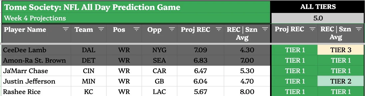 Week 4 requires four (4) players who will accumulate the following stats by tier: