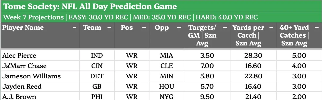 Week 7 requires three (3) players who will accumulate the following stats by tier: