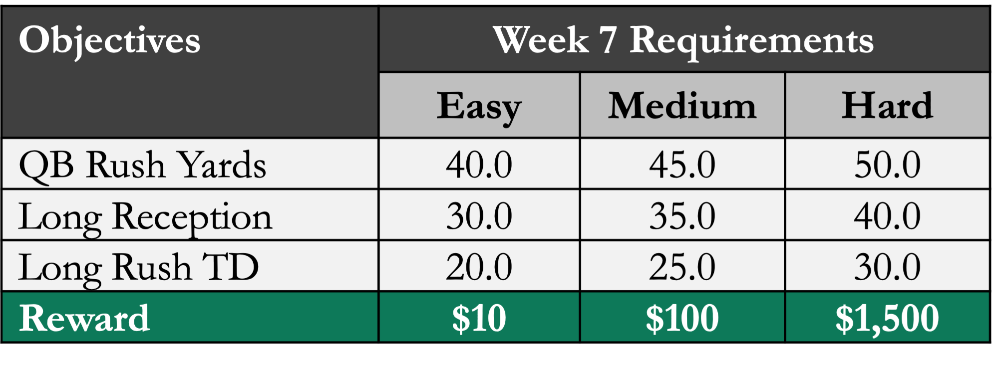Among the three objectives this week, QB rush yards will be the easiest whereas long TD run will be the most difficult. To help with predictions, we based the rankings for the long reception and long TD run on historical performance this season. Although it won’t be a guarantee of this week’s performance, it does provide an indication of potential success. The three-leg parlay will be easier based on number of objectives, but more difficult based on the unpredictable nature of the objectives. Considering the rewards and if you don’t need to purchase many or any players this week, it’s worth the play.