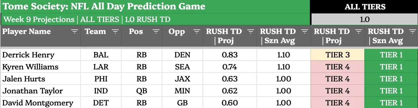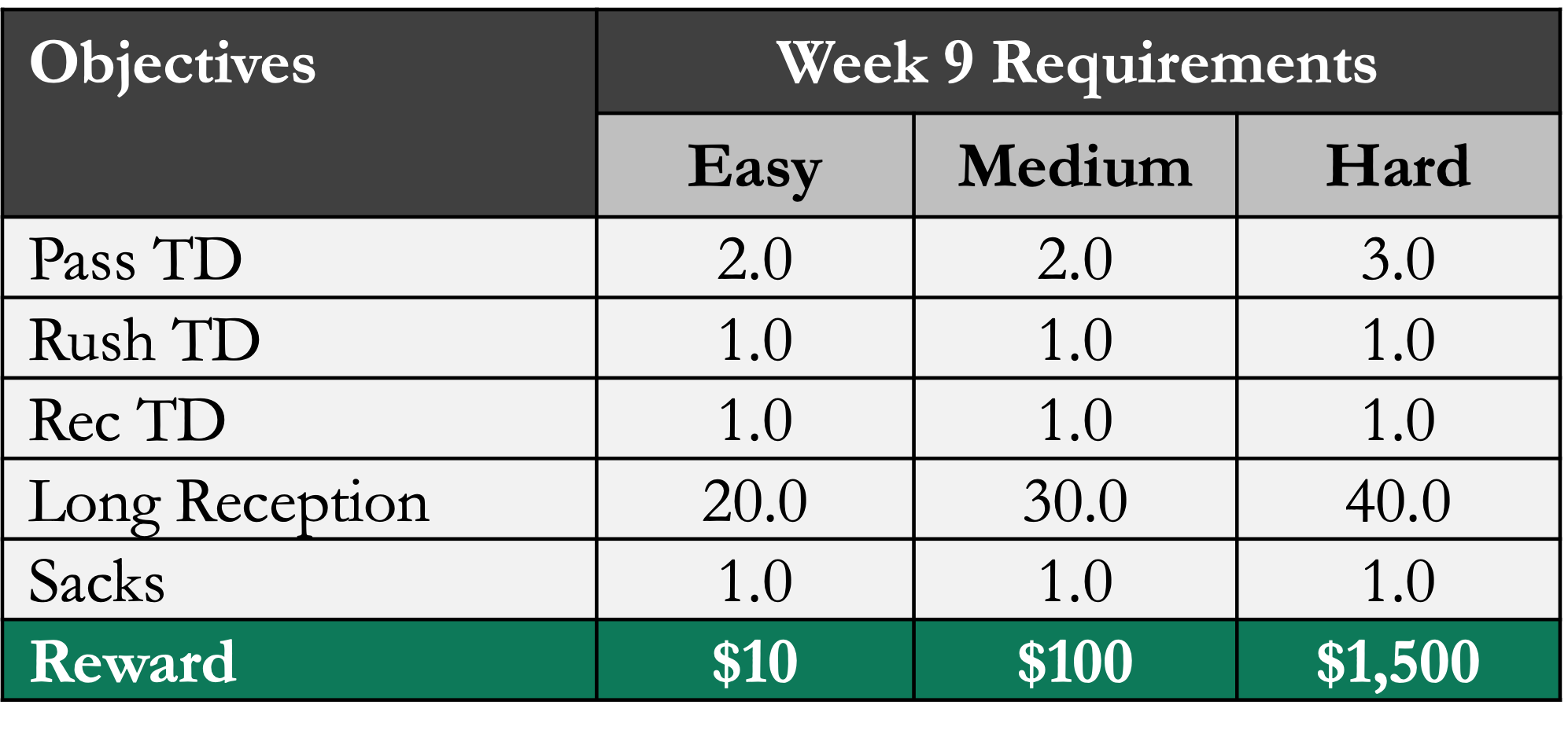 Week 9 requires five (5) players who will accumulate the following stats by tier: