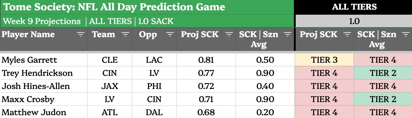 When setting your lineup, pay attention to the projections, season average, and their opponent when deciding who to include. For example - QBs and passing touchdowns. Based on projections, Jared Goff is your top option; however, your top option based on season average is either Jordan Love, Lamar Jackson, or Joe Flacco. Depending on the tier you’re completing, the objectives are different for QB passing touchdowns and long reception yards - the other three objectives are identical. As for rushing, Derrick Henry has been tossing defenders like rag dolls and also leads the projections in rushing touchdowns, so he’s a strong candidate for usage for rushing touchdowns. For receiving, you’ll need to select one player who will have a receiving touchdown and another who will have a long reception. Keep in mind that receiving is not limited to wide receivers and an include running backs or tight ends. Of the five objectives this week though, sacks will again be one of the more difficult. There are some defenders like Trey Hendrickson & Maxx Crosby who have a high number of total sacks and give you some of the highest probability, but there are no guarantees.