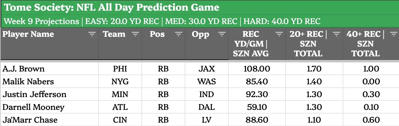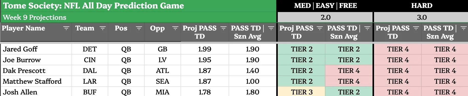 NFL All Day’s Prediction Game has four tiers - free, easy, medium, and hard. Last week, the number of objectives increased to five (5), which repeats for Week 9 but the objectives differ. Instead of longest runs, this week will include the longest reception by yardage. It also includes touchdowns thrown, carried, and caught along with sacks.