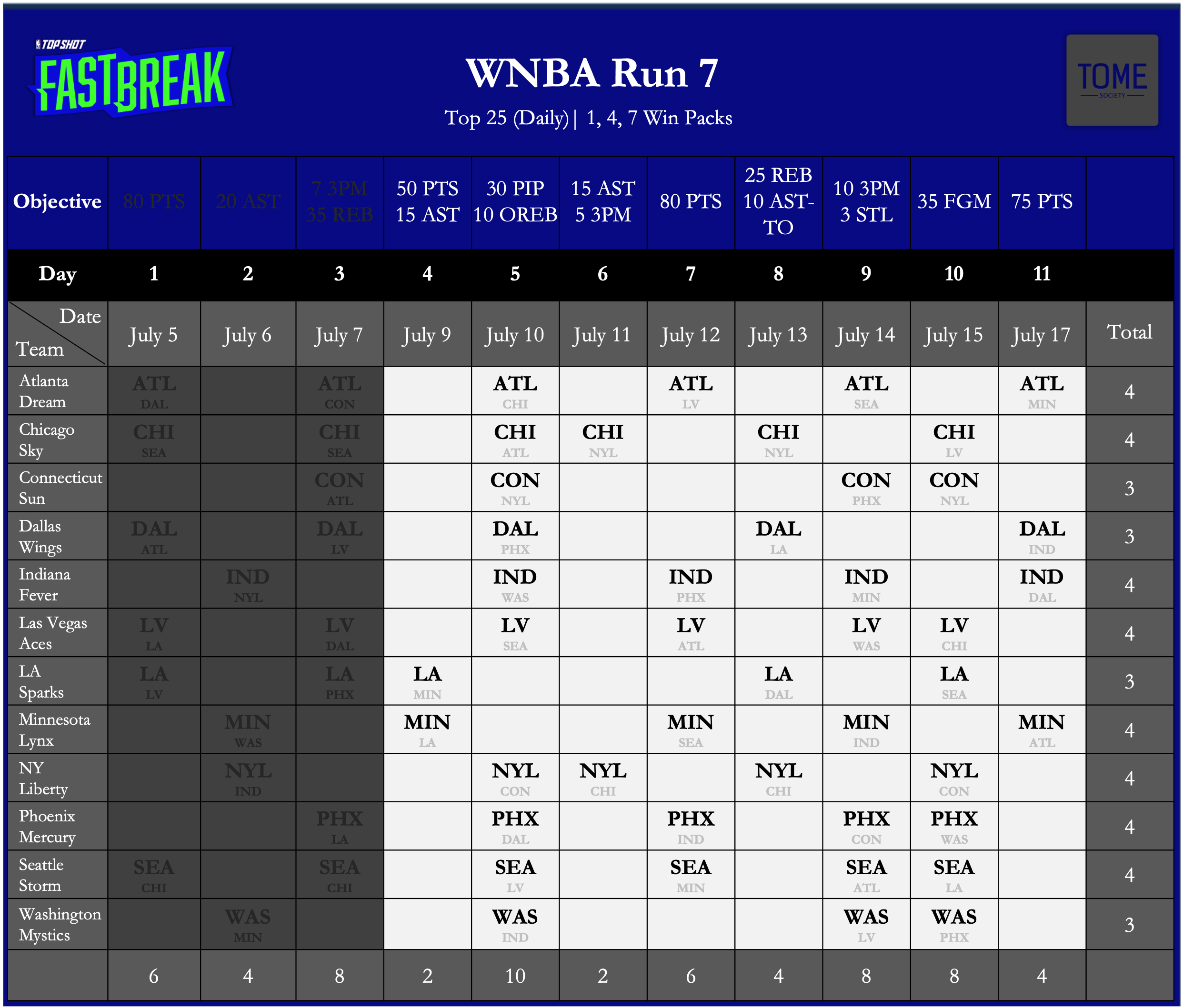 Following the end of this run, there will be a month-long hiatus due to the WNBA All-Star Game, which takes place on July 20th, 2024, and is followed by the 2024 Summer Olympics in Paris (July 26-August 11, 2024). WNBA games kick off again on August 15th, 2024 which will likely coincide with Fast Break Run 8.
